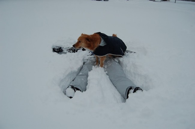 | Caitlin trying to make a snow angel while Chloe just wants to sit on her! |
